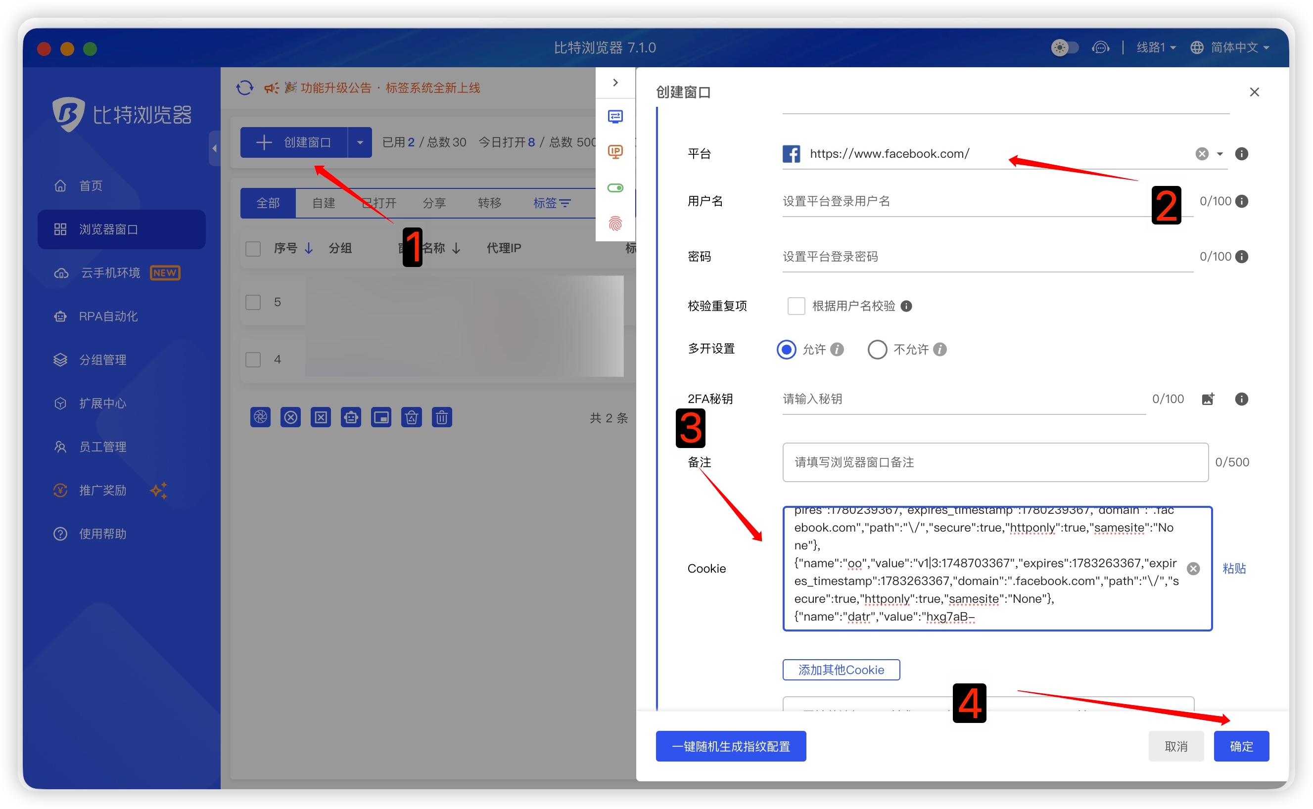 指纹浏览器 cookie 登入Facebook,比特浏览器举例,其它一样!